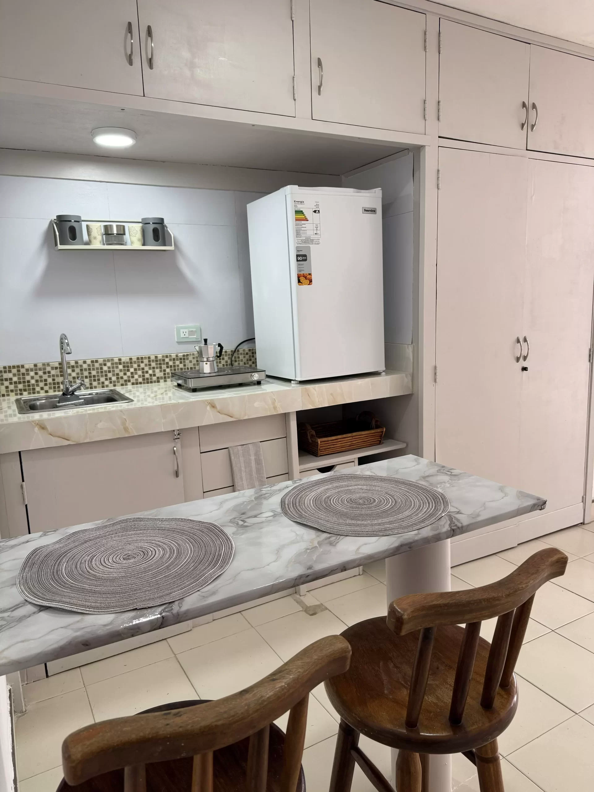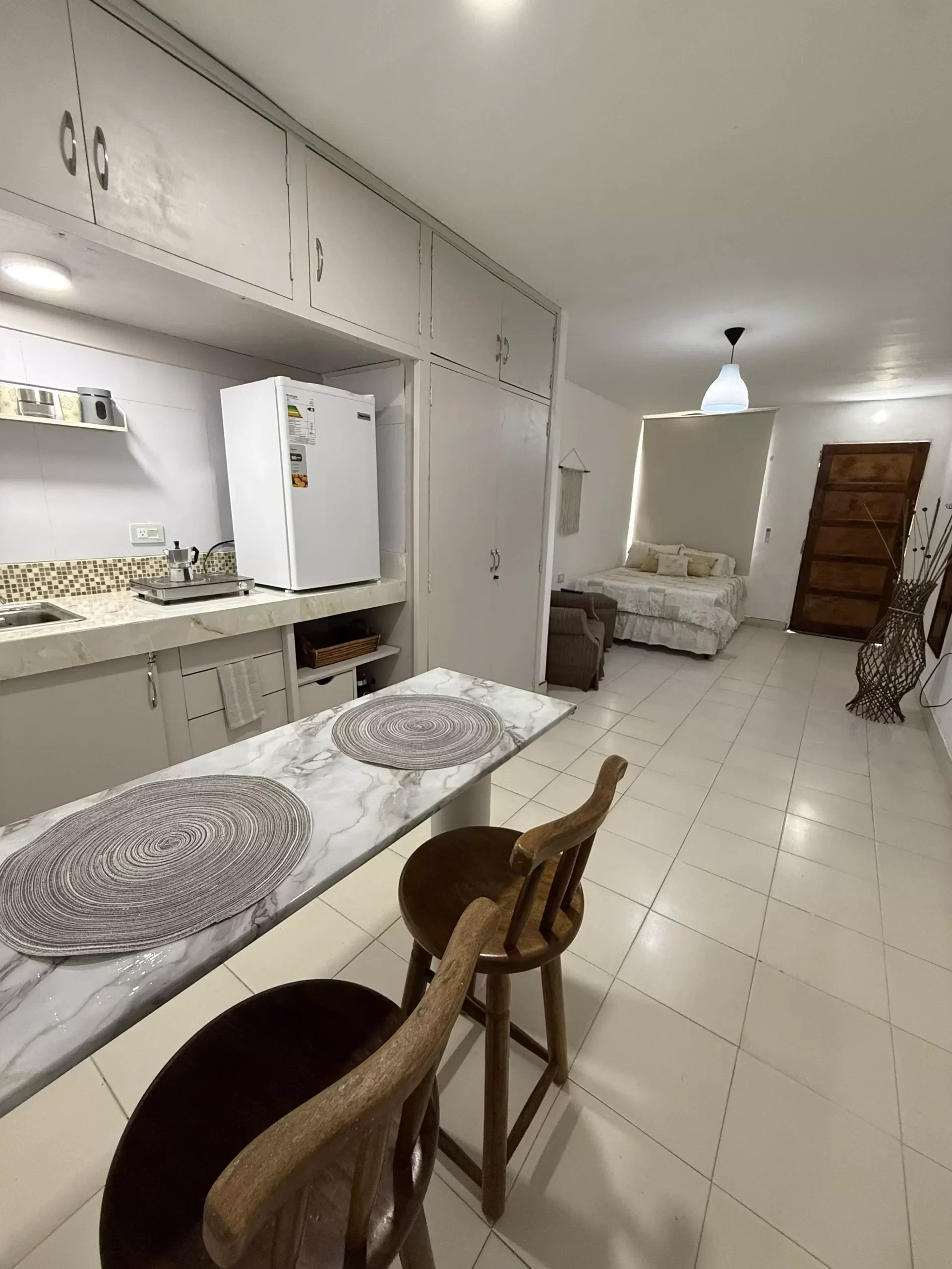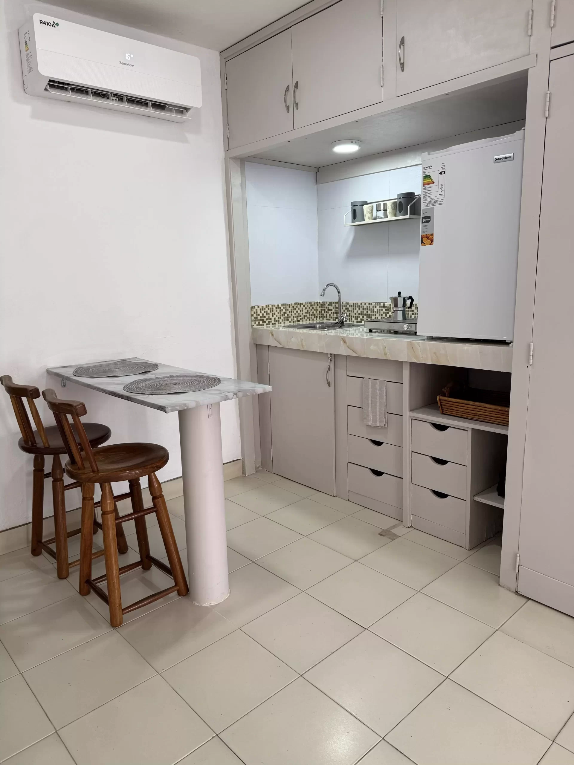 - Cocina funcional: Equipada con una hornilla, nevera, e implementos de cocina esenciales para preparar tus comidas con comodidad.